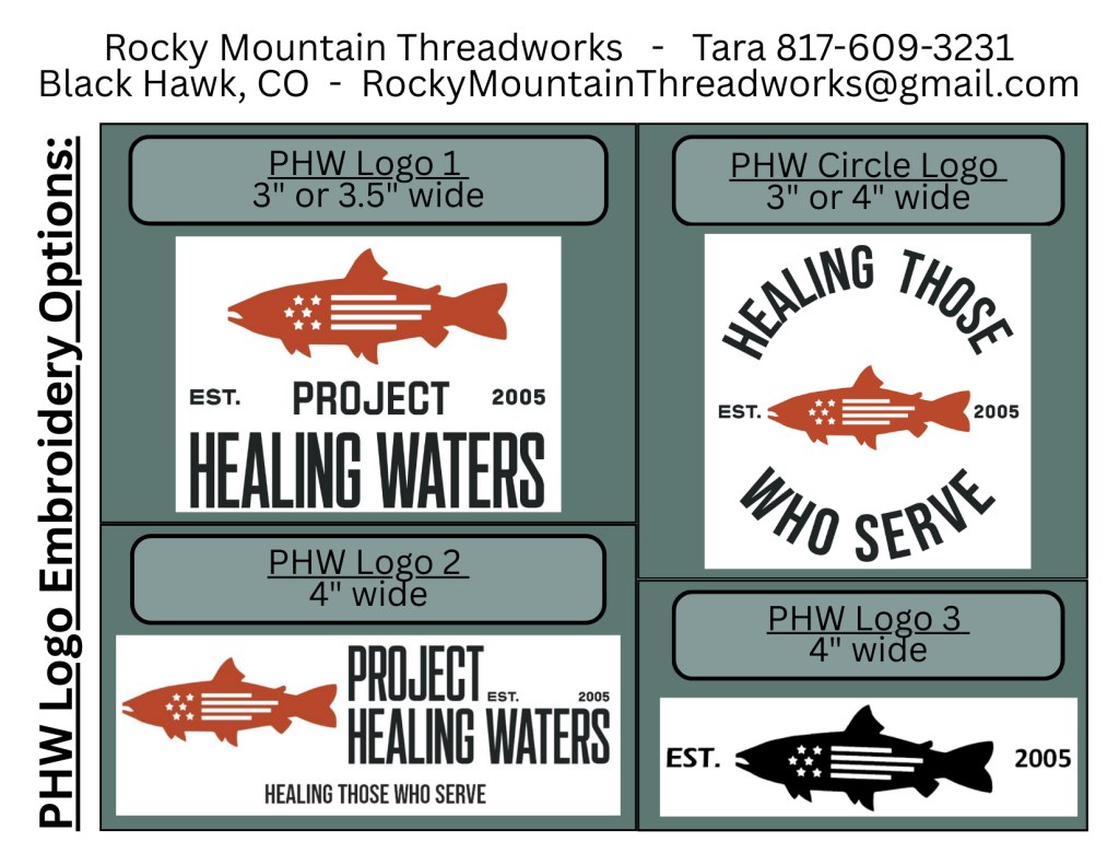 Rocky Mountain Threadworks – Custom Embroidery (service-disabled veteran-owned) is proud to offer embroidery services for Project Healing Waters! Drop off your shirts, jackets, bags, or other items to have the PHW logo embroidered on. Only $11 per embroidered logo, this is special pricing just for PHW members. Have an item you aren’t sure we can embroider? Call us to discuss! We are always open to trying new things!